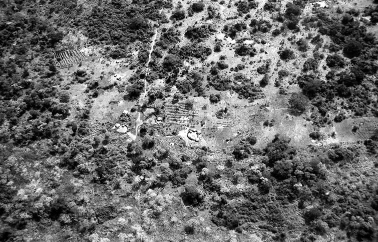 . . . . . . . . . . . . . . . . . . . . . . . This farm view contains two mysteries. The centrally located settlement with stockade is in the pattern of a Mathiniko house and granary from Karamoja. I can not interpret the low rows of bushes above the house and again in the left side of the scene. |
