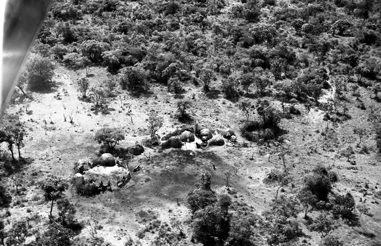 . . . . . . . . . . . . . . . . . . . . . . . A camp with no visible cattle. People can be seen in the central settlement. Cow skins are draped over the corral perimeter. |