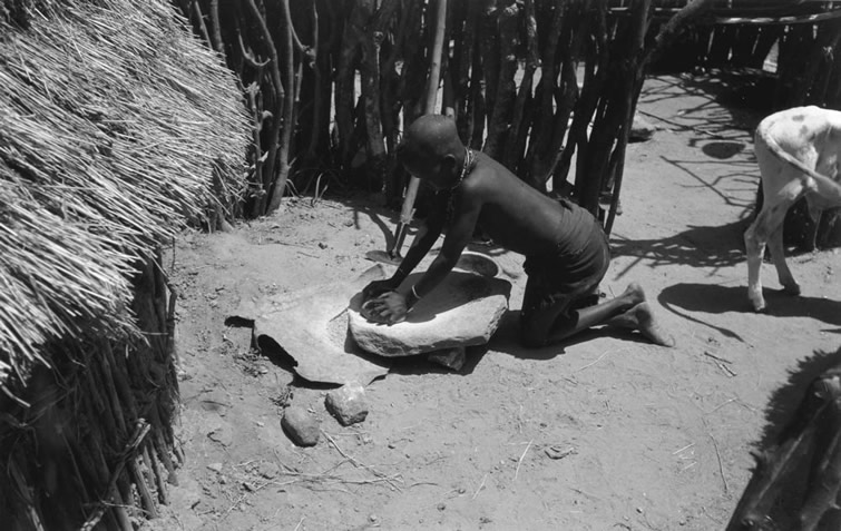 Settlement interior. House on left. In the rear an inner wall of saplings. Grain grinding underway. Hoe standing behind the girl. Settlements here moved at five to eight year intervals. Grindstones being heavy and sometimes worn were often left behind.