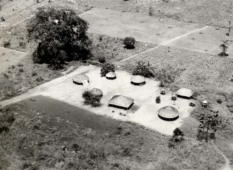rectangular cultivated patch behind the houses indicates