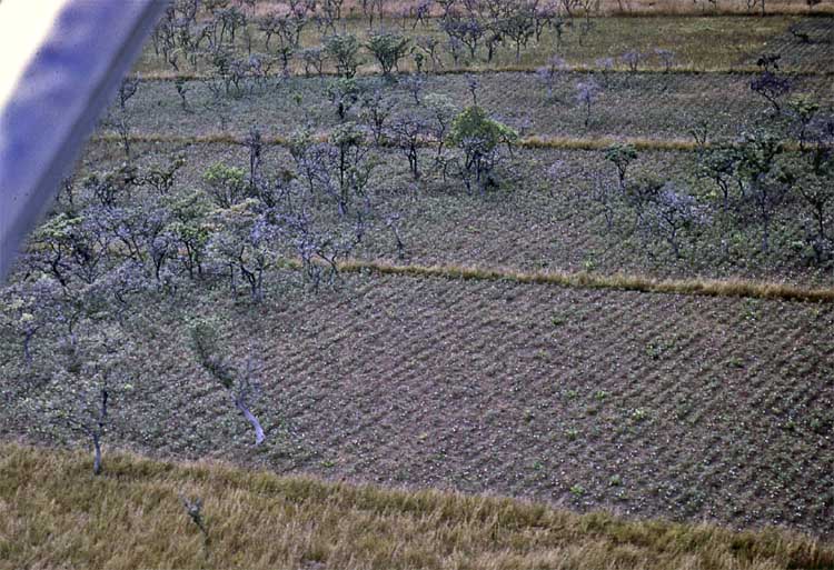 LANGO. . . . . . . . . . . . . . .. . . . . . . . . . . . . . . . . .. . . . . . . . . . . . . . . . . . . . . . . . . . . . . ............ . Young cotton plants in relict woodland. Mystery. One can not plow around trees. The cultivators must hand hoe the wooded area. Strange.