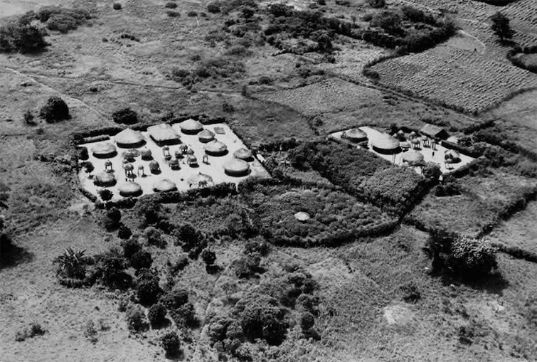 This scene shows plantings of cassava to the right of the settlement and tobacco in the background. |
